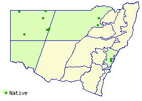 Distribution and occurrence: Scattered throughout inland Australia, mostly between latitudes 20 and 32 degrees S, in all mainland States. Semi arid to arid areas in moist sandy, silty or clay soild at marings of waterholes, dams, creeklines, and on floodplains and gilgai landforms. Usually associated with ephemeral herbaceous herbage amongst shrubland (Atriplex, Mairenana, Muelenbeckia) or woodland (Eucalyptus microtheca, E. largiflorens, E. camaldulensis, Acacia stenophylla.