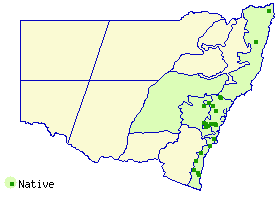 Distribution and occurrence: Often in eucalypt forest, rarely in rainforest, mostly on rocky sites, mainly in coastal areas, frequently bordering the tablelands; north from Bega area.