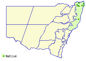 Distribution and occurrence: In subtropical rainforest near the coast, or along banks of coastal streams, north from Forster district; not common.